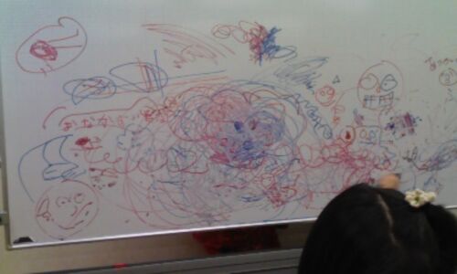 体験、見学の方が大勢参加して頂いて、大賑わい。 その中でもホワイトボードがいい感じになってました。 ちょっと消してしまうのがおしい! この勢いを大きな布にみんなで描くアイデア浮かびました。