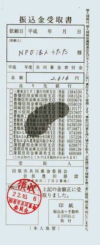 10月3日のワークショップの際に、万博アニキが行った赤い羽根共同募金の領収書が、田原市社協から届きました。 2,616円でした。皆様、御協力ありがとうございました! 11月2日に、愛知県障害福祉課から日本財団に提出する、知事の意見書についての質問があり…