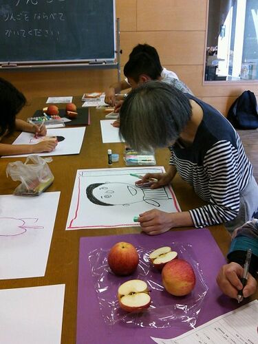 今日はアトリエ・カーグの日! ヘルパーさんが頑張ってみーちゃんを連れて来てくれました。 今回はリンゴを描きましたが、直ぐにかじってしまった方も居られました(笑) おかもっちゃんの手に掛ると、リンゴも素敵な抽象画になります! 今回は、いつもより…