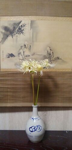 白い彼岸花は、密集して咲いていたので、絡まり合っていて、簡単にはバラバラに出来なかったので、去年と同じように入れました(笑) 去年入れていた辰砂の花瓶は、年末チャリティーで売れました。 気に入っていた物でしたが、法人に還元できて良かったです…